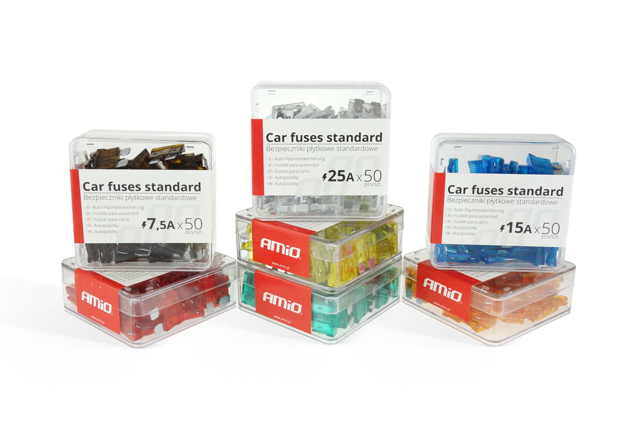 Wysokiej jakości zestaw bezpieczników samochodowych płytkowych typu standard chroniący instalacje elektryczne pojazdów przed ich uszkodzeniem.