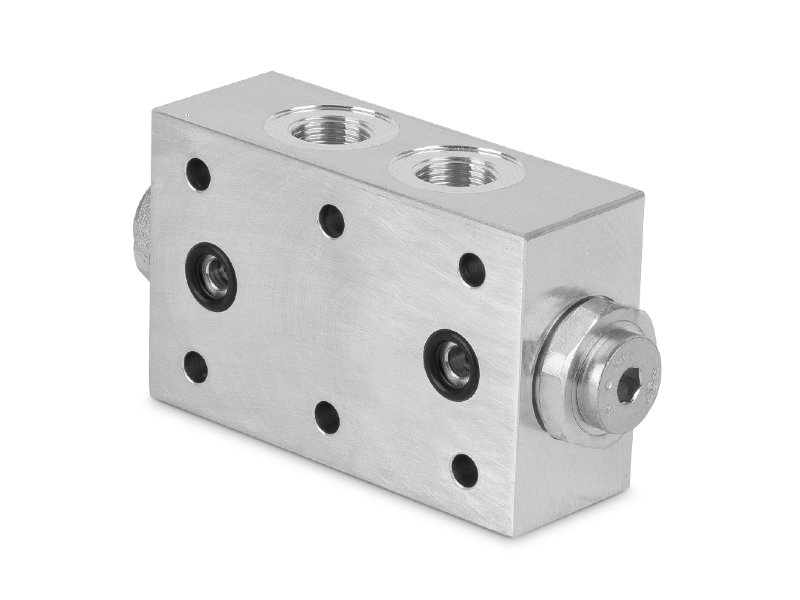 Zawór LVDF01 to kompaktowy, bliźniaczy zawór zwrotny sterowany, zaprojektowany do montażu **płytowego (flanszowego)**. Jest to idealne rozwiązanie dla precyzyjnych i małych aplikacji, które wymagają bezpośredniego przyłączenia do bloku hydraulicznego lub siłownika, co minimalizuje ilość zewnętrznych przewodów.