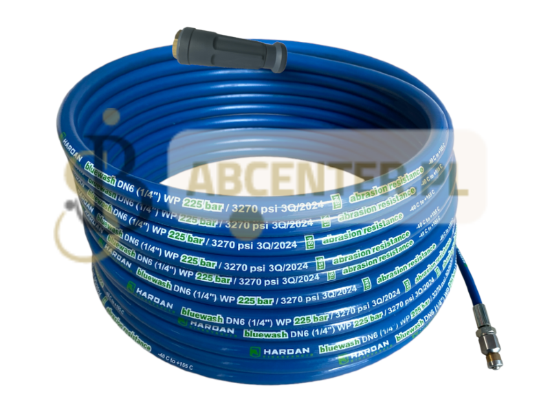 Wąż HARDAN BLUEWASH DN6 1SN 225 bar Abrassion Resist służący do zastosowań profesjonalnych i przemysłowych urządzeń do czyszczenia strumieniem wodnym o wysokim ciśnieniu.