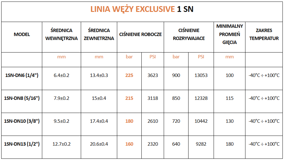 - Wzmocnienie: pojedynczy oplot stalowy o wysokiej wytrzymałości.